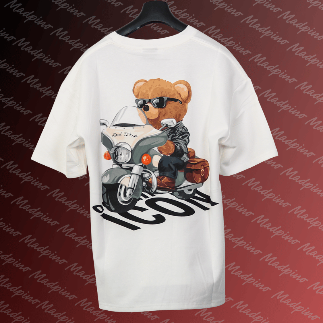 Besonderheiten: Detailreicher Motorrad-Teddy-Backprint, „ICON“-Schriftzug als grafisches Element auf der Rückseite, klassischer Rundhalsausschnitt, formstabiler und dehnbarer Stoff.